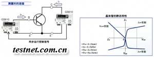 | 测量信号源 GS610 特点-半导体器件(Diode,Tr,FET等)的静态特性测量 | | 同步运行2台GS610测量晶体管的静态特性,从各特性的斜率求常数h。测量IB-IC特性时,如右图所示,使用一台输出极电流IB用的GS610和一台测量集电极电流IC用的GS610,同步运算来测量特性。测量VCE-IC特性时,在发射极-集电极间连接GS610,输出VCE,测量集电极电流IC,则用1台GS610即可完成特性测量。 | |